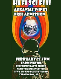 Submitted by Allen on Mon, 02/08/2016 - 18:35"HiFi - SciFi II" - The Winds will present music from the world of Science Fiction and Video games for the second time in HiFi-SciFi II. The concert will be held at the "Farmington Performing Arts Center" 12329 N. Hwy 170 and Blue Sky Road, Farmington AR. Concert starts at 7 pm and admission is free.