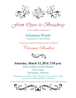 The Arkansas Winds Community Concert Band will be presenting the concert "From Opera to Broadway (and a little in between)" featuring Carmen Sanders, Nashville Symphony Chorus Mezzo-Soprano. The concert will be at the Arts Center of the Ozarks, 214 South Main, Springdale, Arkansas at 7:30pm. Admission is $10.00 and will be a fund raiser for the Winds trip to Richardson, Texas to perform at the Association of Concert Bands Convention on April 16, 2010.